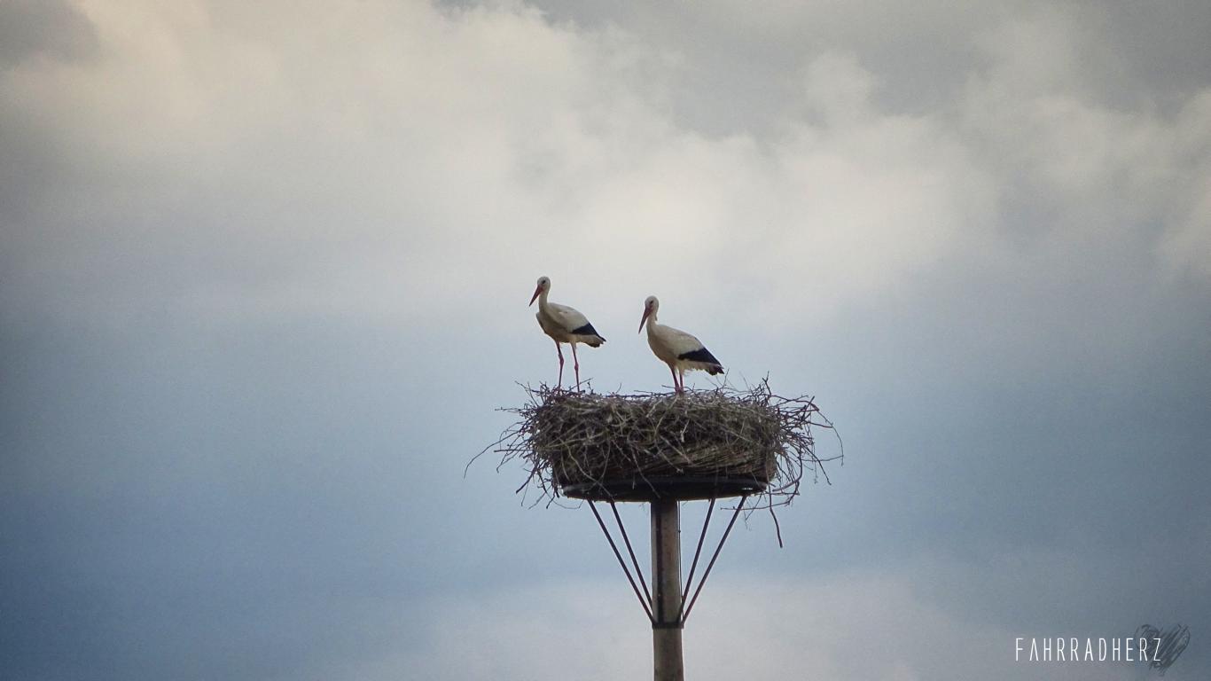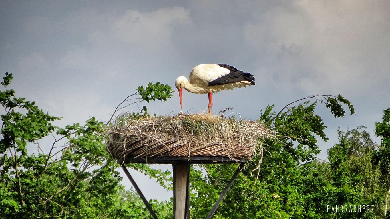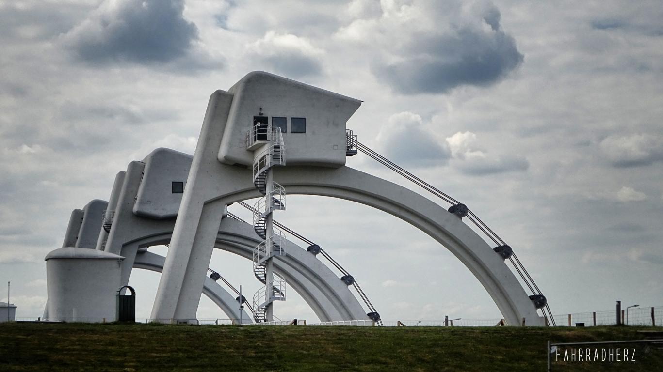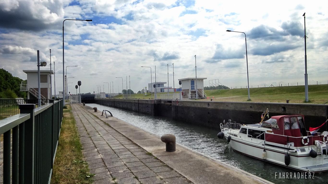 Über den Lekdijk fahre ich entlang der Auen weiter in Richtung der Stadt: Wijk bij Duurstede. Der Deich hat es aber in sich. Je nachdem von welcher Richtung der Wind kommt, fühlt es sich an als würde man einer permanenten Steigung „Paroli“ bieten müssen. Entlang der Deichpassage kann man viele Störche sehen. Auch die Pferdekoppeln sind gut gefüllt. Alles in Allem ein traumhaftes Naturbild. Auf der Hälfte der Deichpassage vom Lekdijk taucht irgendwann ein großer Staukomplex auf. Wie aus einem „Star-Wars“ Film sehen die Stautore von weitem sehr „Gewöhnungsbedürftig“ aus.