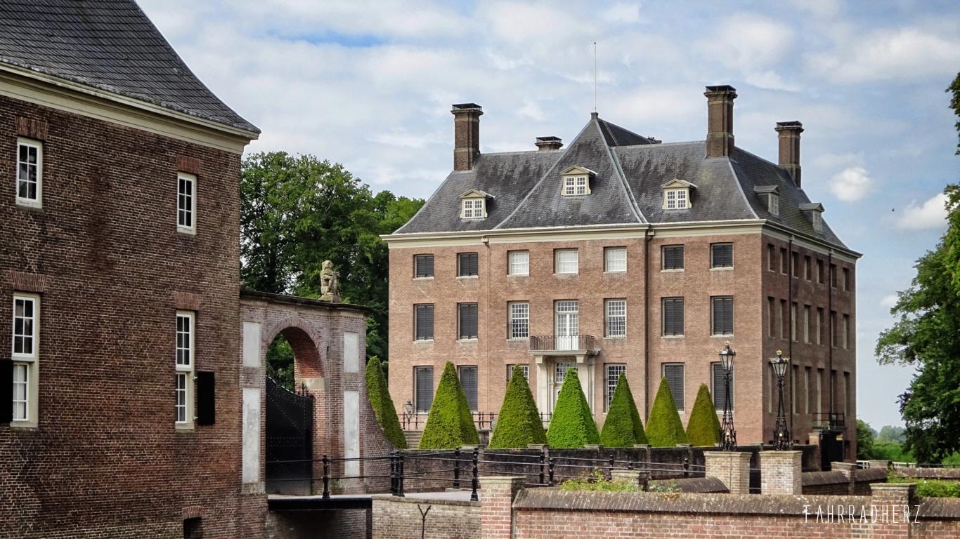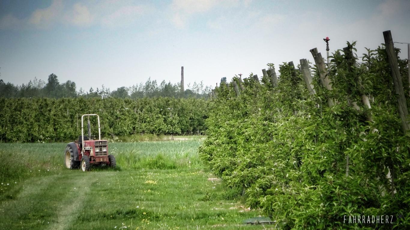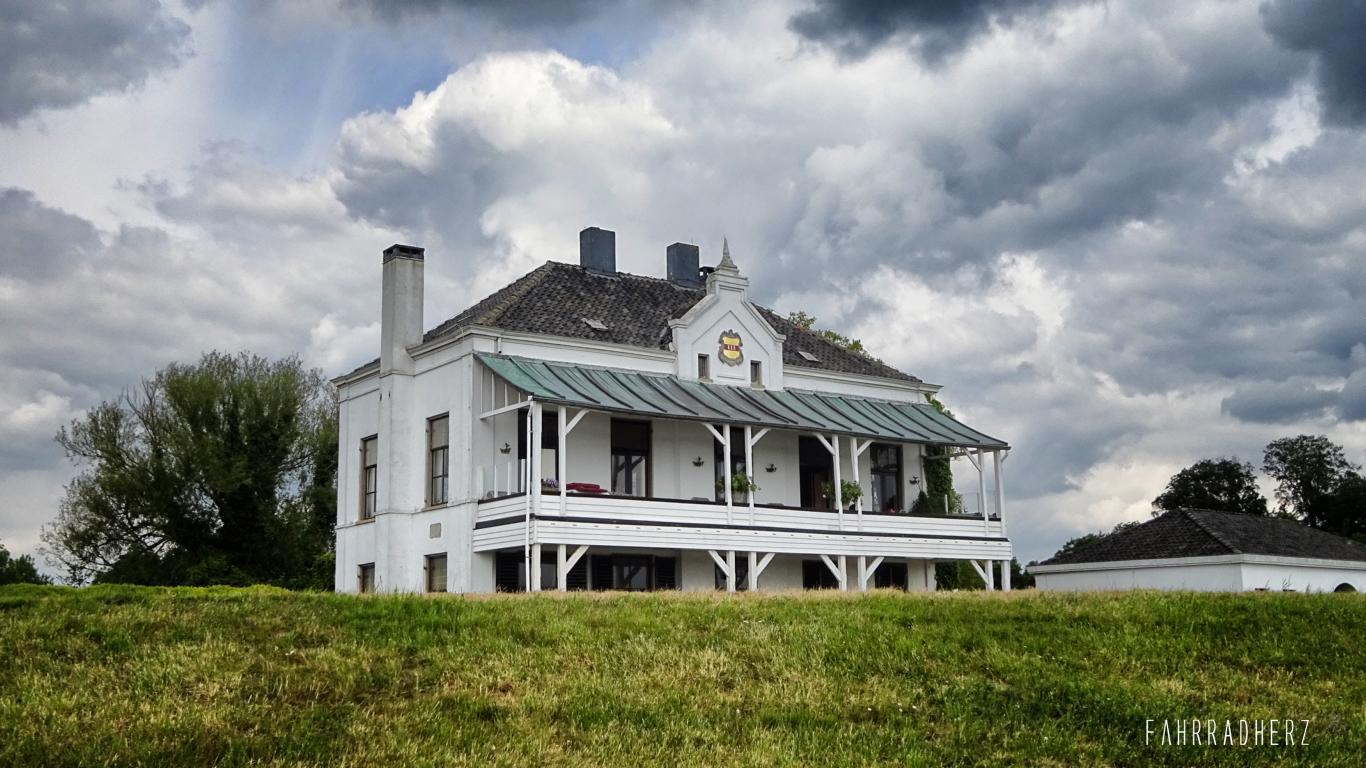 Richtung Norden geht es zum Nederrijn. Der Nederrijn ist eigentlich ein Ausläufer vom Rhein. Obstwiesen, Kleefelder und lange Deichstraßen begleiten mich ein ganzes Stück bevor ich den Nederrijn mit der Fähre passieren kann. Auf den Deichen hat man einen wunderbaren Ausblick über die Felder und über den Schiffsverkehr. Ab und an passiert man eine kleine Pumpstation. Diese sehen in der Region fast überall gleich aus. Die kleinen Pumpstationen oder auch Pumphäuser genannt, verteilen die Bewässerung auf den Feldern, oder schützen im Bedarfsfall vor Hochwasser. Mit dem Überqueren des Nederrijns und einem Fährgeld von ca. 1,00 EUR pro Radfahrer, wechselt nicht nur automatisch die Provinz von Gelderland in Utrecht, sondern auch das gesamte Landschaftsbild.